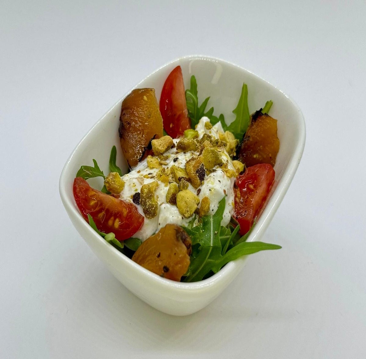 CREAMY BURRATA SERVED WITH BRANDY PEACH & PISTACHIOS
