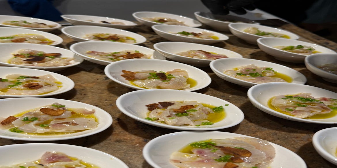 ZESTY SEABASS CEVICHE ACCOMPANIED BY TENDER ARTICHOKE HEARTS AND CRISPY GARLIC